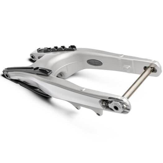 Kyvná vidlice tohoto modelu GASGAS je odlitá z jednoho kusu hliníku, má nižší hmotnost než ta stará a je o něco tužší. Je zde také mnohem odolnější jezdec řetězu a vodítko je mnohem zaoblenější, aby se zabránilo zachytávání o zem, když kolo překlápíte v hluboce vyjetých zatáčkách. Kyvná vidlice je doplněna novou 22mm osou zadního kola, která doplňuje vylepšené vlastnosti ohybu celého podvozku. A konečně, přehledné značky pro nastavení řetězu zajišťují rychlou a snadnou údržbu.