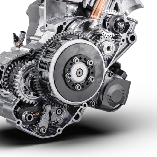 Uvnitř motoru MC 250 najdete robustní a mimořádně spolehlivou membránovou spojku DDS (Damped Diaphragm Steel) umístěnou v koši z oceli obráběné na CNC strojích. Tento styl spojky se obejde bez tradičních vinutých pružin a místo nich je zde ocelový přítlačný talíř s jednou membránou a systém tlumení, který pomáhá přenést výkon na zem.