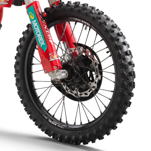 Abyste získali vzhled inspirovaný závodním týmem, je tato edice Factory Edition doplněna sadou závodních kol Factory Racing Wheel Set. Ve středu kol jsou náboje vyrobené CNC z hliníku a následně eloxované černou barvou. Poté jsou'přišroubovány k super pevným, černým ráfkům EXCEL Takasago s kvalitními paprsky a černými niply. Nejenže jsou příjemná na pohled, ale mají také opravdu nízkou hmotnost, což pomáhá minimalizovat neodpruženou hmotnost a zajistit lehčí ovladatelnost.
