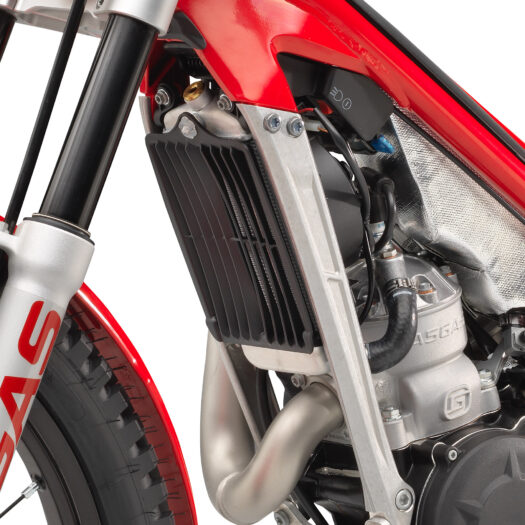 Velmi chytrý integrovaný chladicí systém našich trialových kol TXT RACING je dále vylepšen díky přepracovanému ventilátoru, který zvyšuje průtok vzduchu a snižuje hlučnost. A díky chladiči, který je úhledně schovaný mezi hliníkovými držáky motoru, je celý systém dobře chráněn před poškozením při nárazu a zajišťuje tak trvalý výkon dvoutaktních motocyklů.