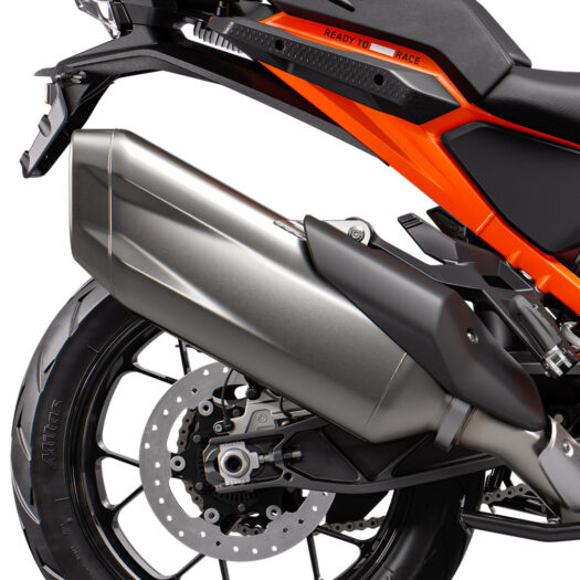 KTM 1290 SUPER ADVENTURE S má kompletně přepracovaný výfukový systém, který se umí hlasitě přihlásit o slovo. Dva nové svody vedou výfukové plyny do hydroformingem tvarované sběrné komory se dvěma katalyzátory. Díky nim a spolupráci se 3 lambda sondami zůstávají emise v rámci limitů předepsaných normou EURO 5. Na opačném konci výfukového systému zaujmou nové nerezové koncovky výfuku zajišťující typický dvouválcový zvuk.