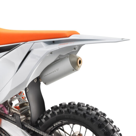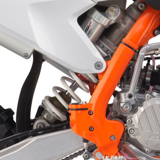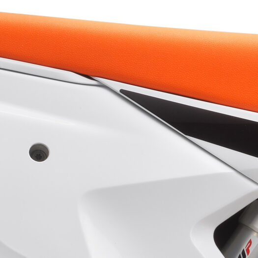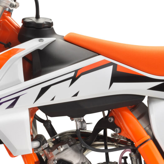 Motocykl KTM 85 SX 2024 zaujme kapotáží v bílo-oranžovém provedení a oranžovým potahem sedla, nechybí však ani odvážná grafika v černém, oranžovém a fialovém odstínu. Už ve startovním boxu tak tento stroj dává najevo své vítězné ambice.