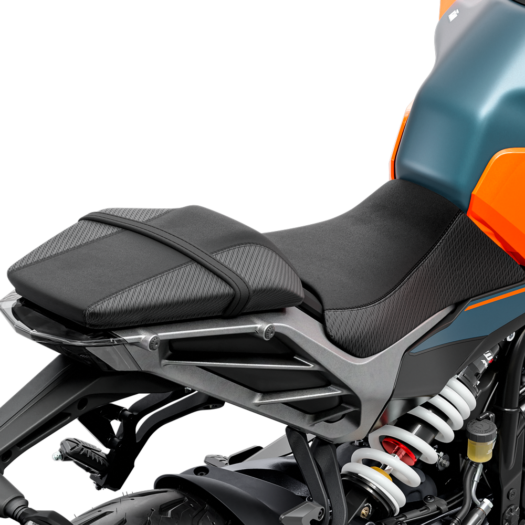 Sedlo s vyšším polstrováním a užším profilem pro jezdce i spolujezdce zajišťuje celkově vyšší komfort a lepší ergonomii. Potřebuješ sedlo níž nebo naopak výš? KTM 125 DUKE je standardně vybaven sedlem s výškou 800 mm, ale pomocí volitelného sedla z nabídky KTM PowerParts lze jeho výšku snadno upravit na 820 mm.