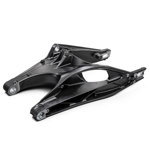 Nově tvarovaná kyvná vidlice z litého hliníku představuje pevnou a odolnou platformu pro zadní odpružení. Přímý úchyt pro tlumič je nyní odsazen do strany, což přispívá k super závodnímu vzhledu. Rovněž tak vznikl dodatečný prostor pro nový tlumič výfuku, který zajišťuje výraznější charakter.