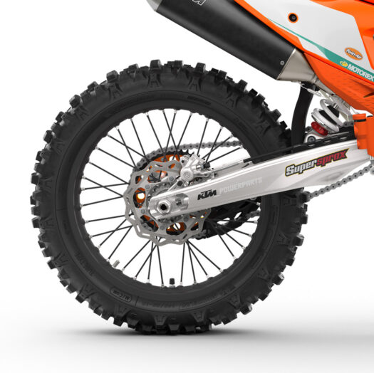 Motocykl KTM 250 EXC-F CHAMPION EDITION je vybaven pneumatikami MICHELIN Enduro, které zajišťují výjimečnou trakci díky inovativnímu designu dezénu, který se ideálně přizpůsobí písčitému, travnatému nebo blátivému povrchu stejně jako tvrdším terénním tratím.