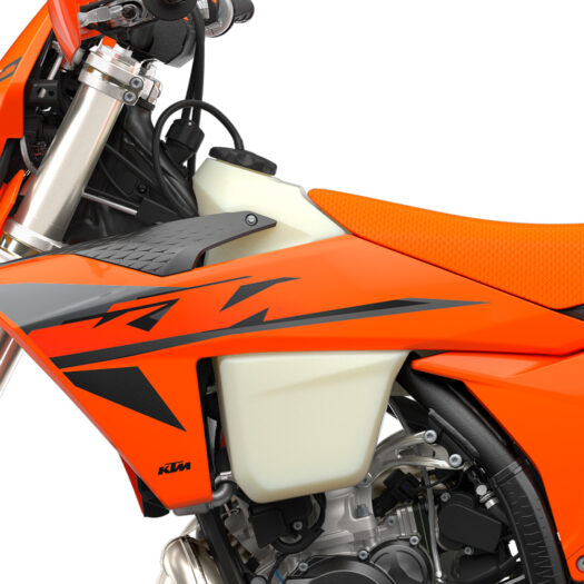 Průsvitná polyethylenová (XPE) palivová nádrž je poznávacím znakem enduro strojů KTM. Nejenže díky ní snadno získáš rychlý přehled o hladině paliva, ale zásluhou dlouholetého vývoje se také jedná o nejpevnější a nejspolehlivější palivovou nádrž vůbec. Pro rok 2024 je nádrž vybavena jednodílným palivovým čerpadlem s palivovým filtrem, což umožňuje ještě důslednější využití celého objemu nádrže. S objemem 8,9 l paliva můžeš vyrazit na trail nebo závodní trať s naprostým klidem.