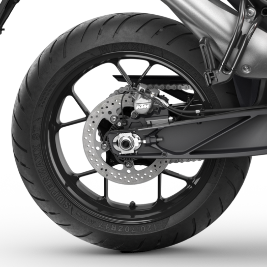 Motocykl KTM 790 DUKE je vybaven extrémně lehkými litými koly vyrobenými pomocí procesu nízkotlakého lití. Nejenže pomáhají snižovat celkovou hmotnost stroje, ale také minimalizují neodpruženou rotující hmotnost. Obouvají pneumatiky MAXXIS Supermaxx ST.