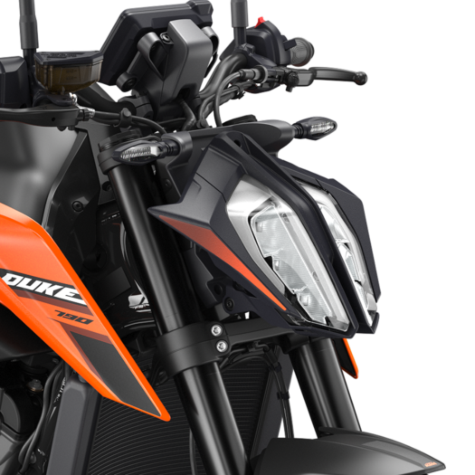 LED světlomet propůjčuje modelu KTM 790 DUKE nejen výhružný pohled, ale také zajišťuje, že se při noční jízdě vymaní z temnoty. Hlavní světlomet je po stranách lemován dvěma LED pruhy, které slouží jako denní svícení, ale jsou jasně vidět i v noci.