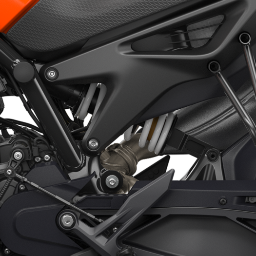 Zadní kolo krotí špičkový plynový tlumič WP APEX s progresivní pružinou a nastavením předpětí. Díky tomu motocykl KTM 790 DUKE nabízí sportovní jízdní vlastnosti, aniž by tě připravil o pohodlí na delších cestách.
