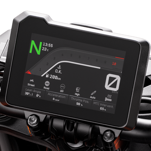 Jezdci si mohou vybrat ze čtyř jízdních režimů, konkrétně SPORT, STREET, RAIN a TRACK. Režim STREET je výchozím nastavením a je určen pro pohodlnou jízdu po městě, režim RAIN přijde ke slovu, jakmile začne být trochu kluzko. Režim SPORT oceníš, když si chceš jízdu trochu přikořenit, ovšem až v režimu TRACK ti KTM 790 DUKE nabídne plný výkon a možnost omezit kontrolu trakce, vyrovnanou reakci na plyn nebo možnost vypnout funkci proti zvedání předního kola.